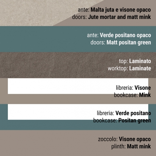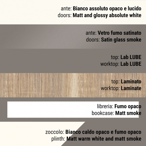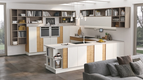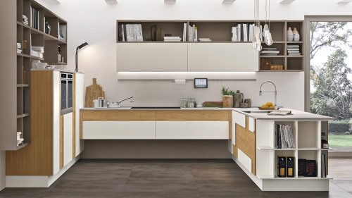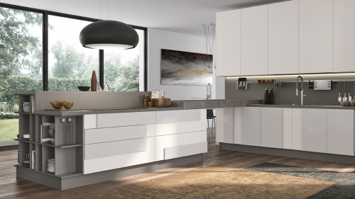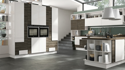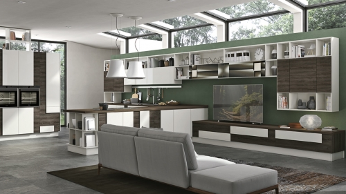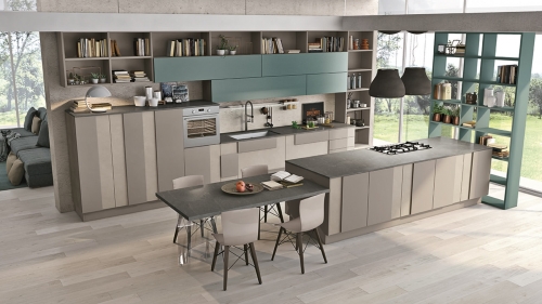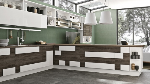 Moving geometries that make your kitchen unique. Creativa is a furnishing program for those who want to design and think their living space in a personal and therefore exclusive way. Games of colors, materials and shapes for endless creativity.