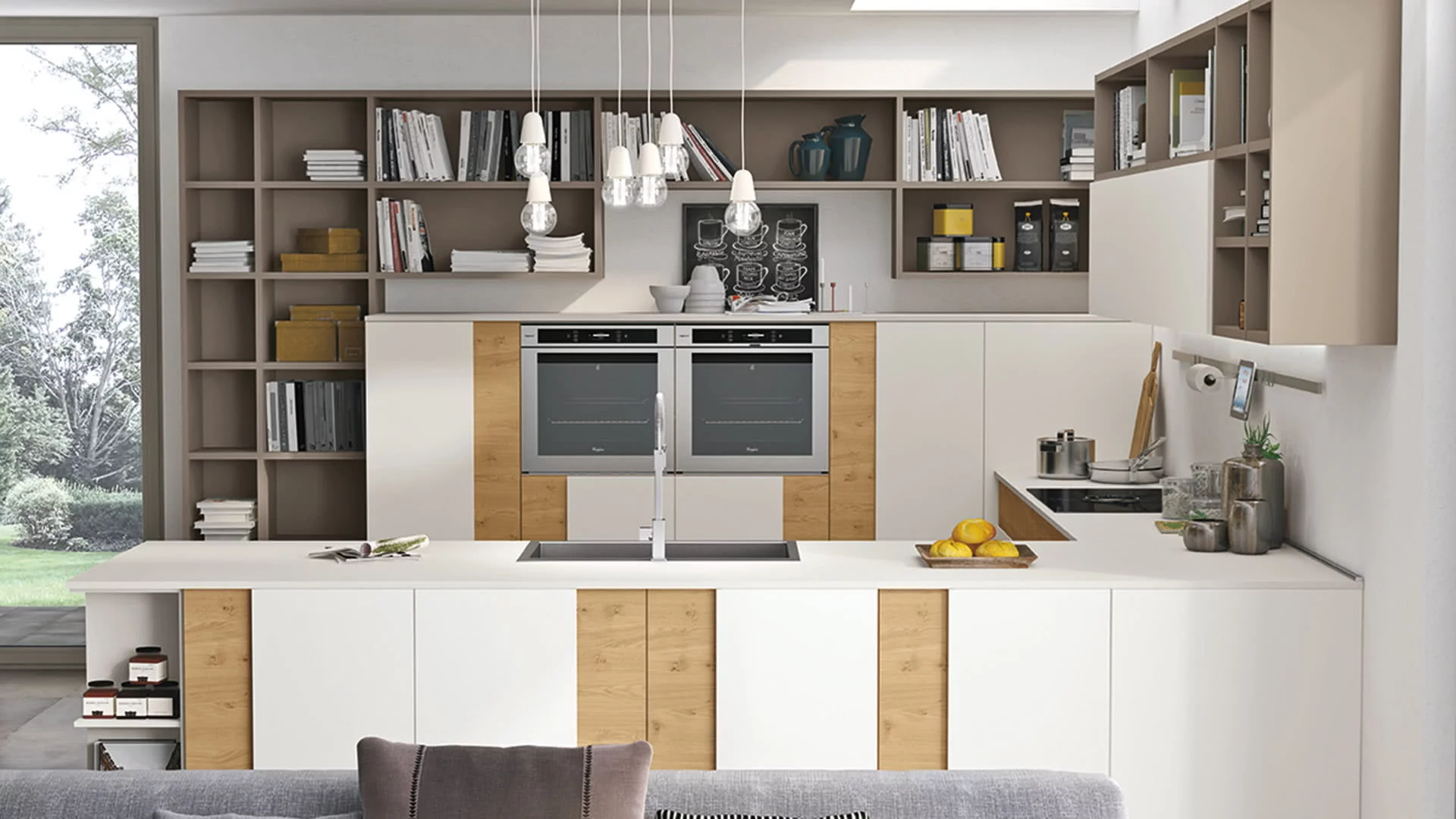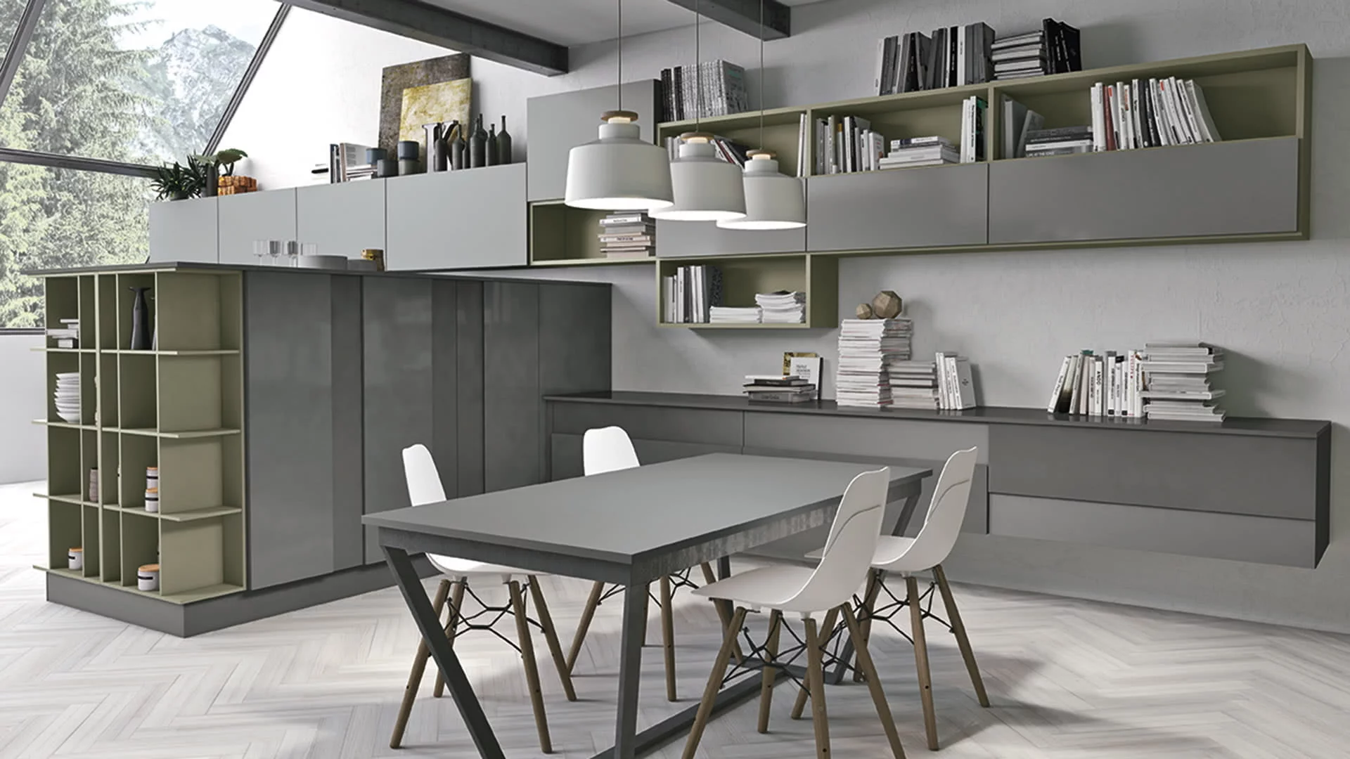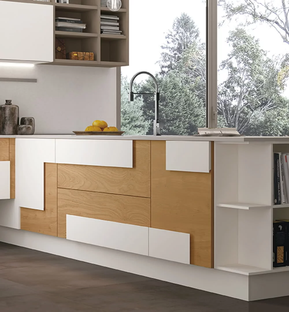 Moving geometries that make your kitchen unique. Creativa is a furnishing program for those who want to design and think their living space in a personal and therefore exclusive way. Games of colors, materials and shapes for endless creativity.