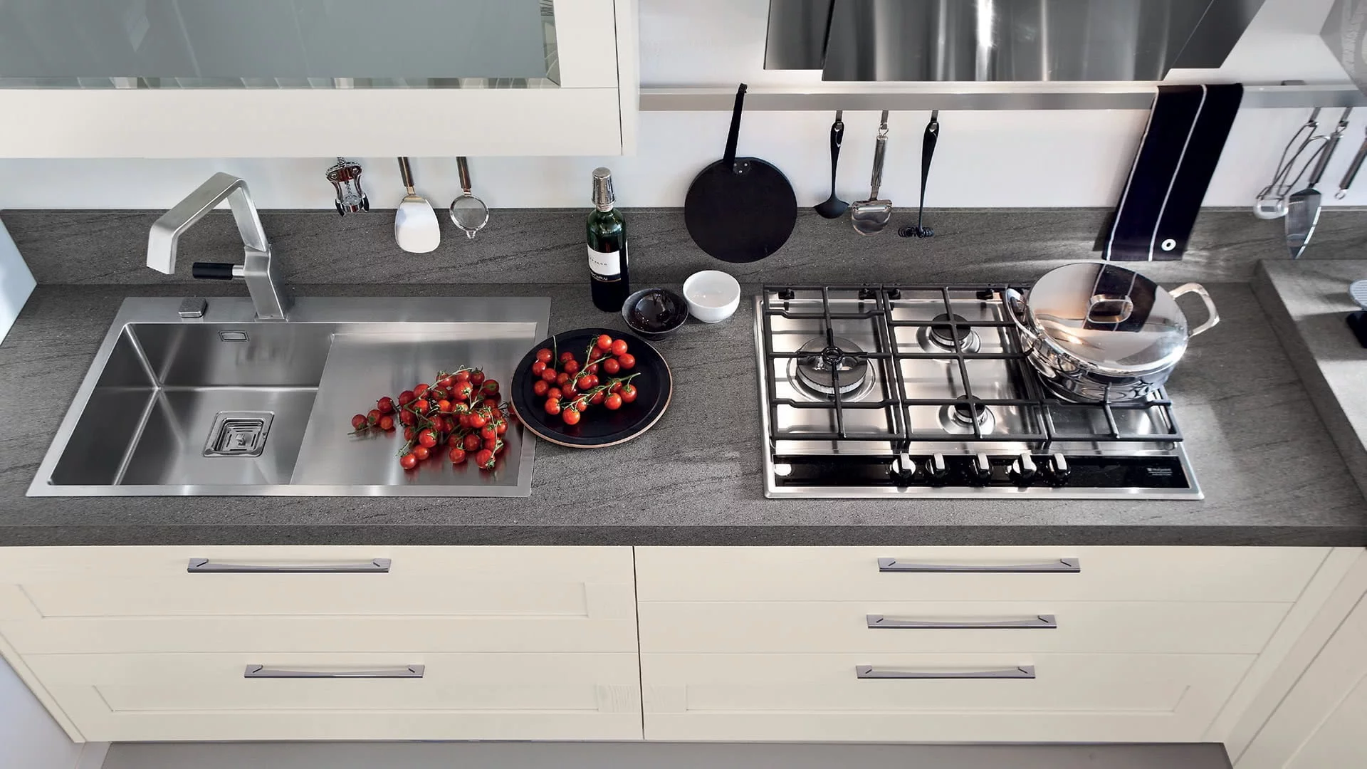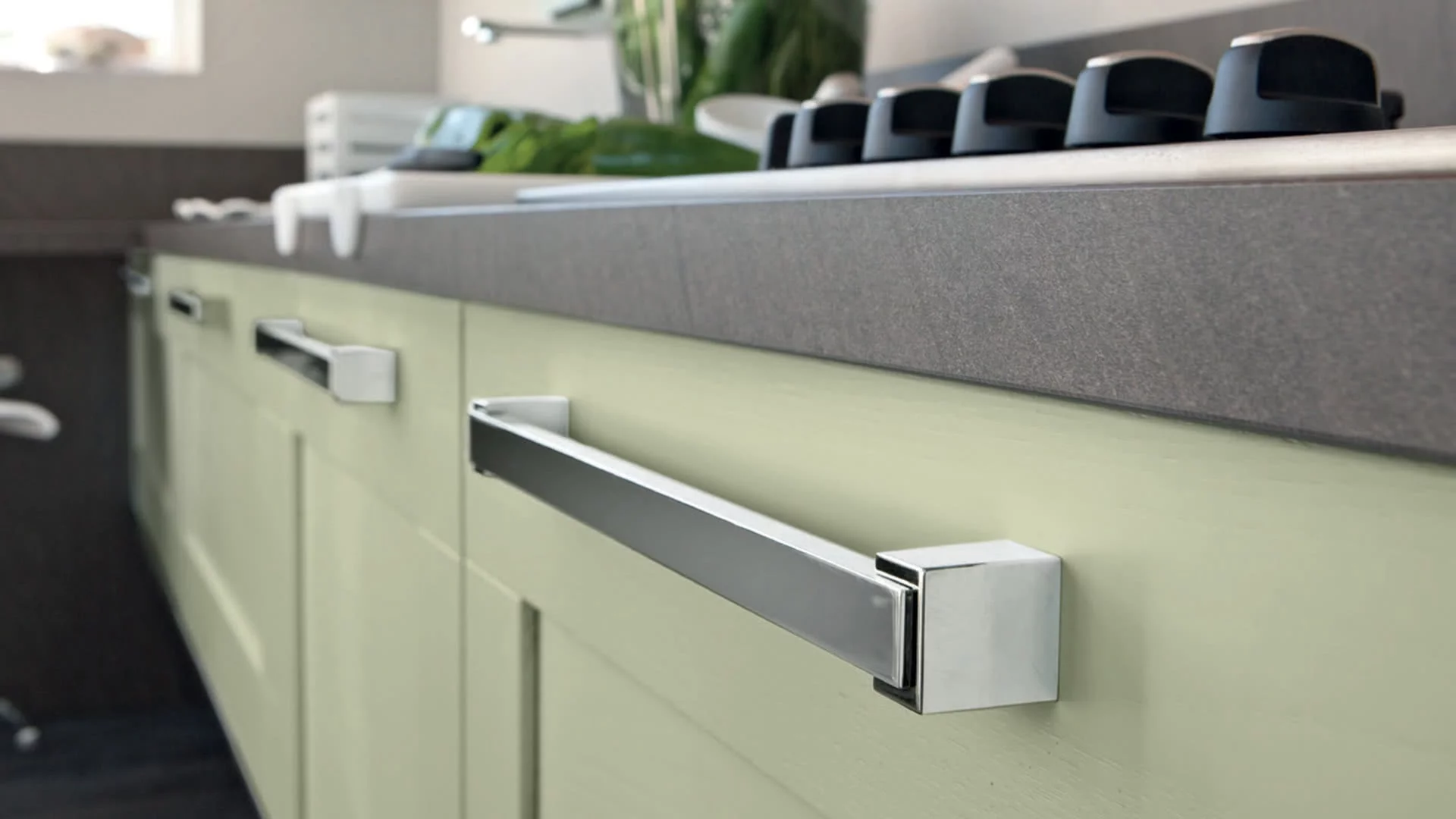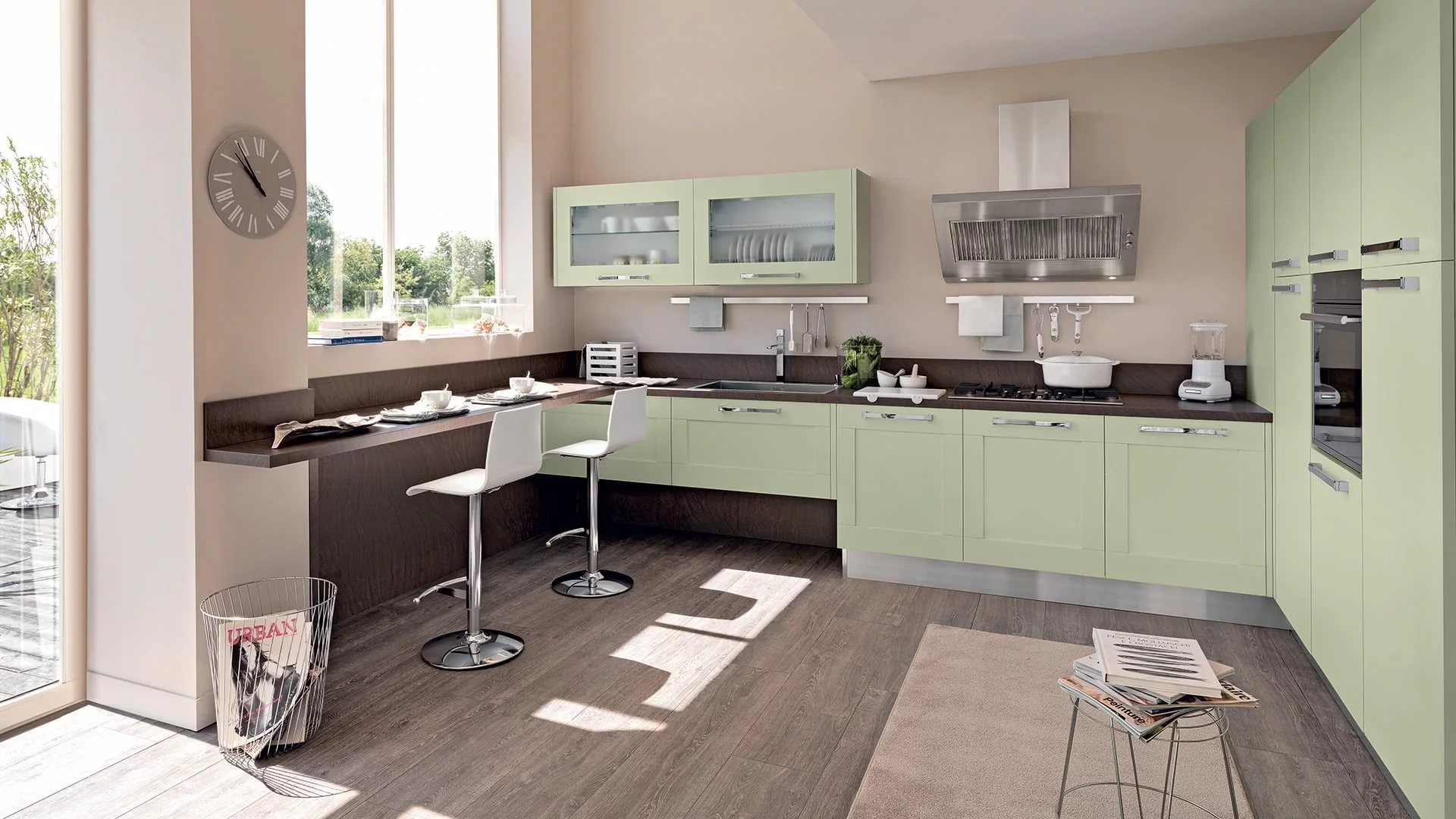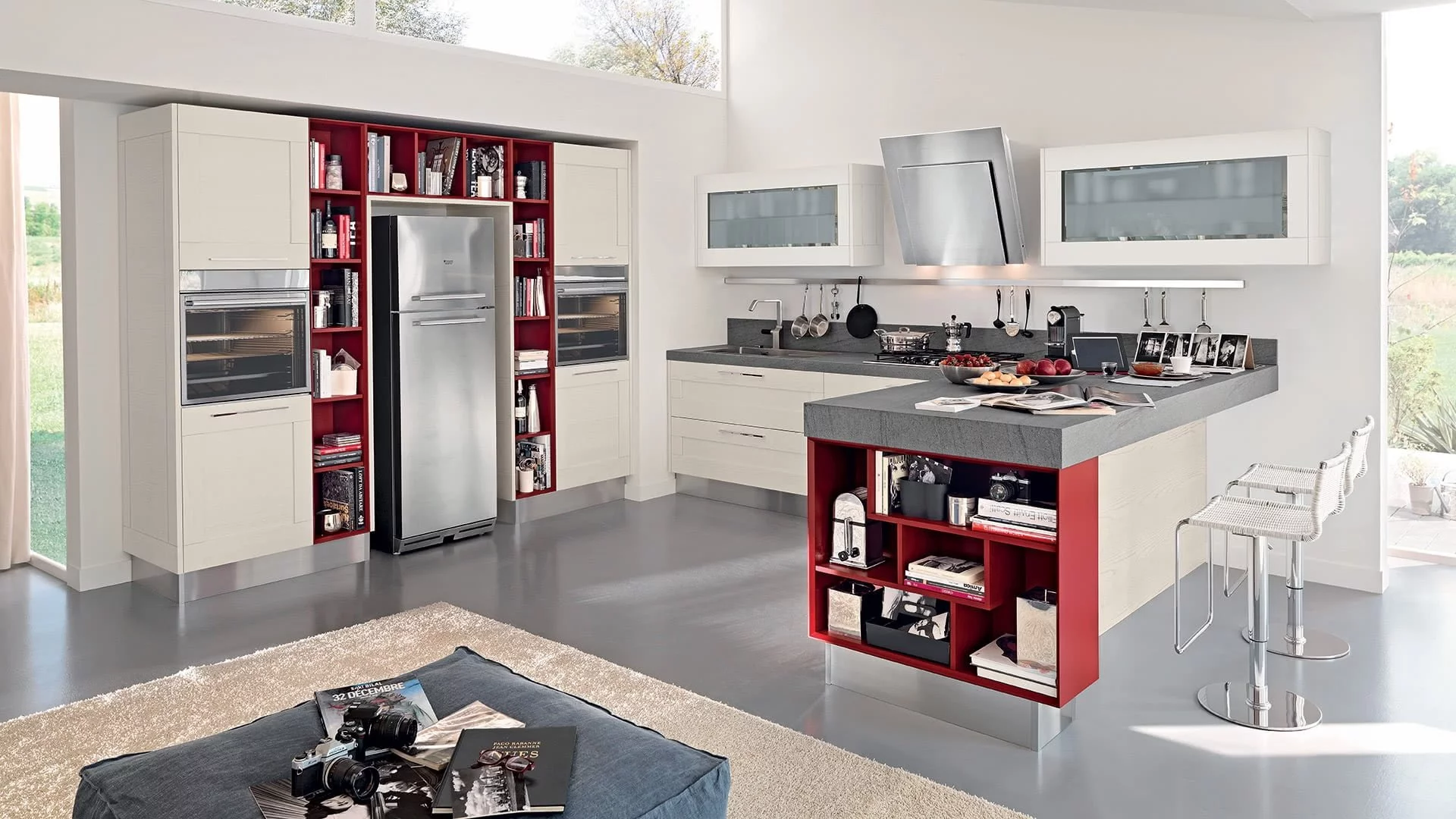 A kitchen with a framed door characterized by a modern design, which can be interpreted in a perfect union of romantic suggestions and minimal features. The essences are the most current, in the warm tones of the Roveri, the Ash and the Walnut. A palette of soft or bright, shiny and opaque colors which, combined with the smooth or decorated doors, makes Gallery capable of expressing all its versatility. A modern reinterpretation of ancient traditions for the door with the integrated handle and the rounded grip, which characterizes the line becoming a decorative element, interchangeable with different types of handles according to your preferences. Gallery, a timeless kitchen.